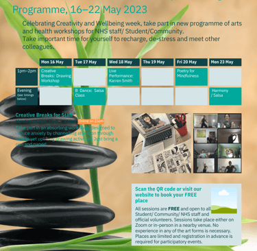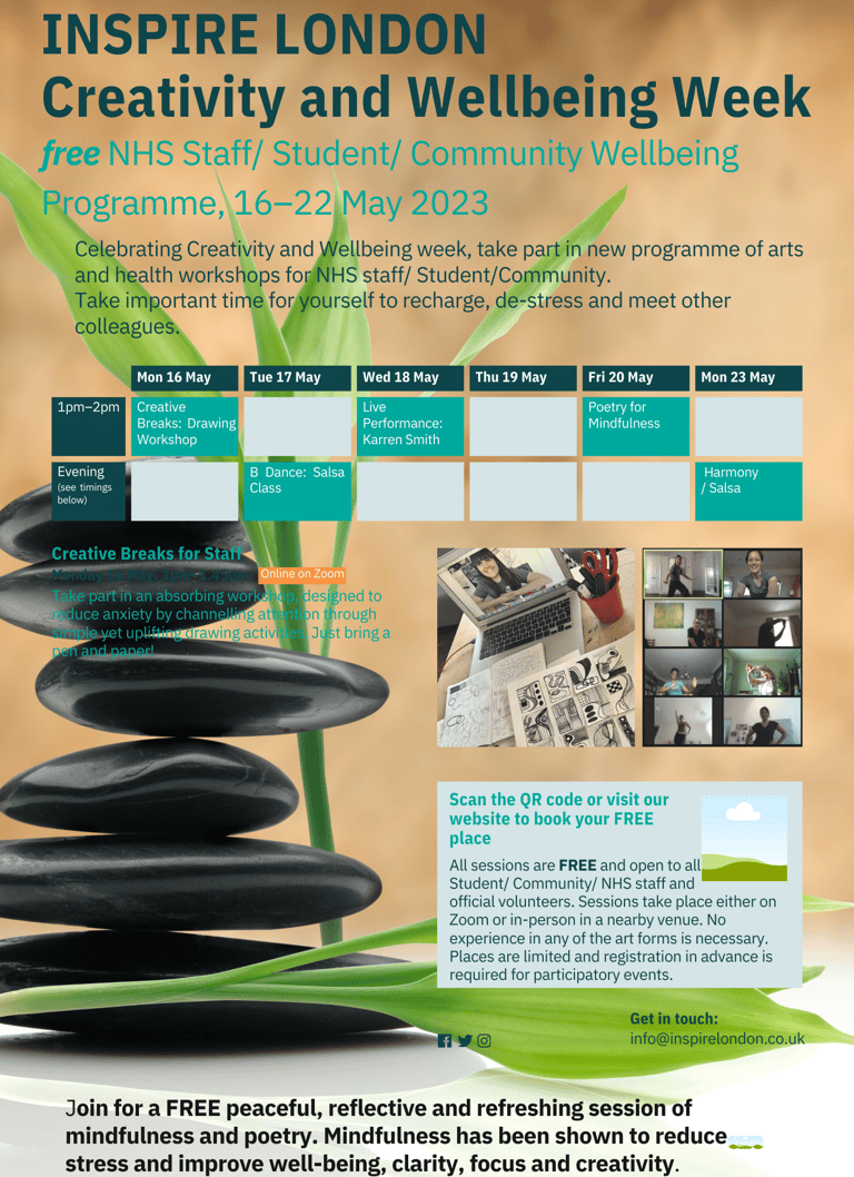 INSPIRE London COMMUNITY Celebrating Creativity and Wellbeing week, take part in new programme of arts and health workshops for NHS staff/ Student/Community.